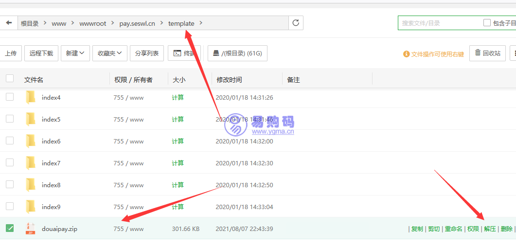 1.我们下载好文件后将模板文件上传至这个目录/(你支付域名)/template