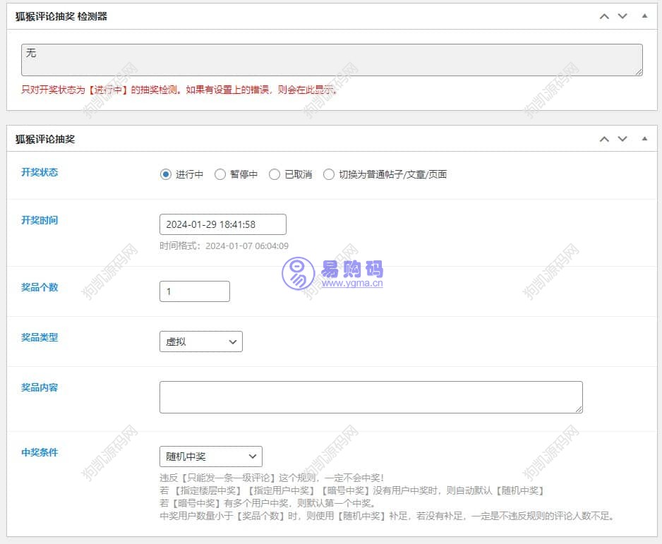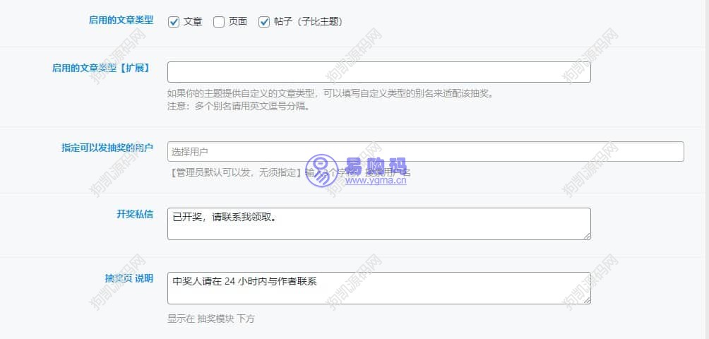 可自定义在自己创建的新文章类型的文章里显示“创建抽奖”模块。