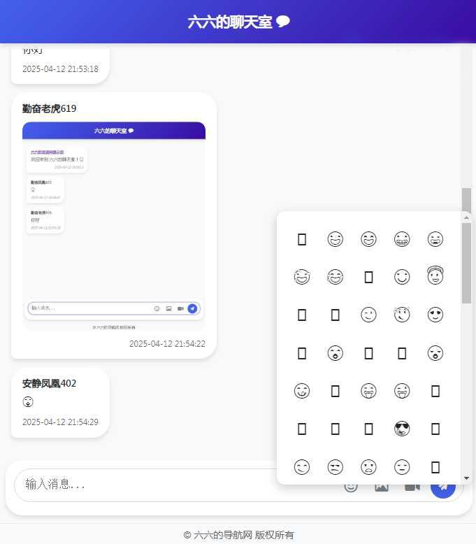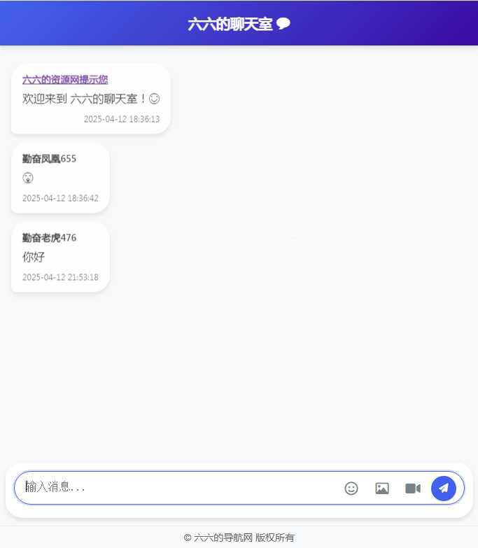 资源介绍 六六的资源网首发纯PHP编写的聊天室无需数据库,上传虚拟空间就可使用。满足基本聊天需求,聊天数据全部存储到虚拟服务器空间。 功能包括表情发送,图片上传浏览放大关闭,视频上传浏览关闭,昵称随机生成。 预览截图 1. 本站所有资源均来源于用户分享和网络收集,如有侵权请联系站长! 2. 分享目的仅供大家学习和交流,您必须在下载后24小时内删除,不得商业用途,不得违反国家法律。否则后果自负! 3. 本站提供的资源不保证100%完整;不提供技术服务,请大家谅解!