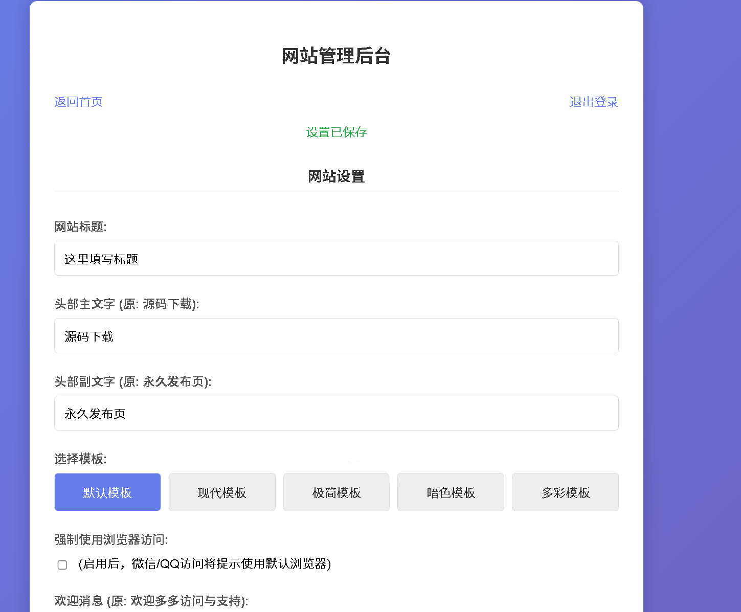 4:进入后台可编辑 3 个固定修改链接、添加或删除额外链接、设置底部文字及选择模板。