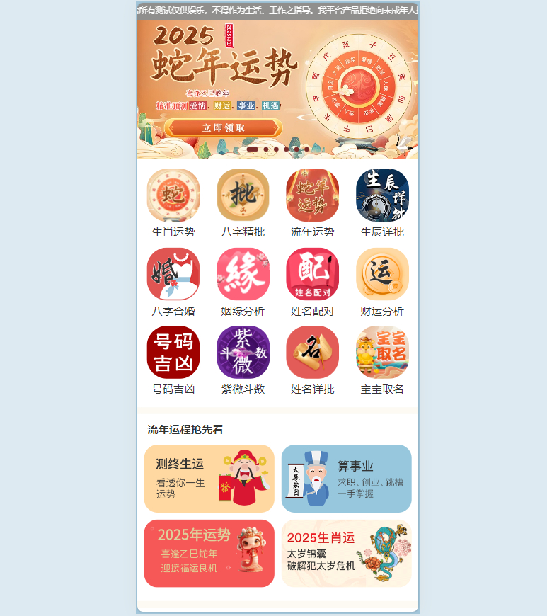 这是一款2025蛇年运势测算、网站源码、 风水起名、八字算命、算财运姻缘等,第三方支付去除虎皮椒支付改用易支付 (通用市面彩虹易支付) 免去开通费用为您节省168元的开支,本源码为付费测算可以为你带来超强的变现能力,喜欢的自行部署吧!