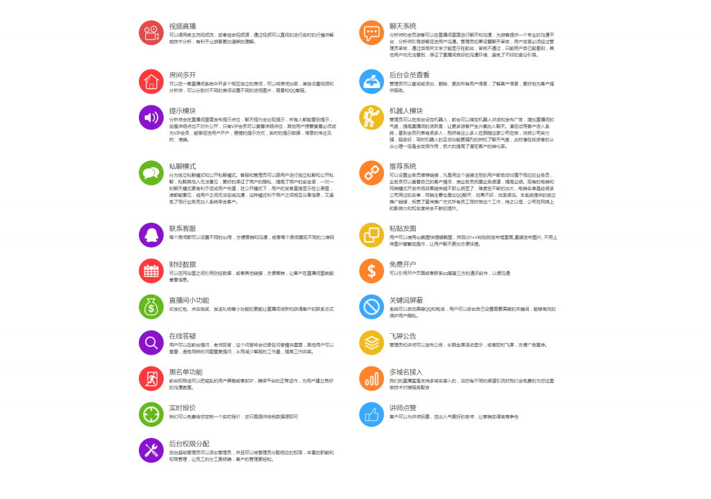 能够在一套直播间体系中开多个彼此独立的房间,能够将房间加密,独自设置视频和剖析师,能够分别对不同的房间设置不同的出场图片,布景和QQ客服。