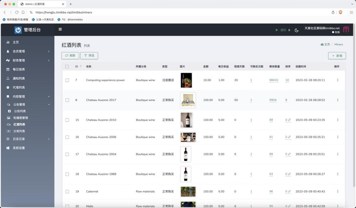 红酒投资理财盘,基于矿机理财程序二开的,上次打包出来的程序还有一些都没测试,正在慢慢清库存