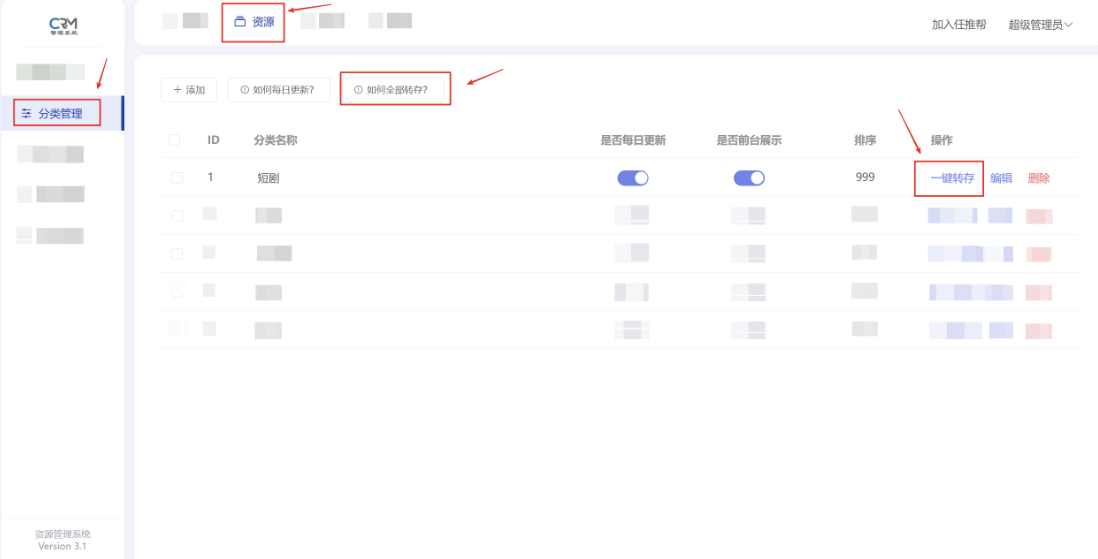 4后台-资源-分类管理-一键转存-设置好每日更新-这样就能解放双手了