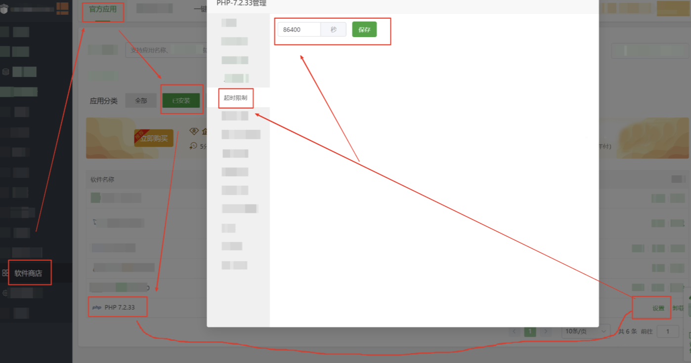 解决办法:修改超时限制至最大值 86400 保存后,PHP需重启服务 (如下图) 。