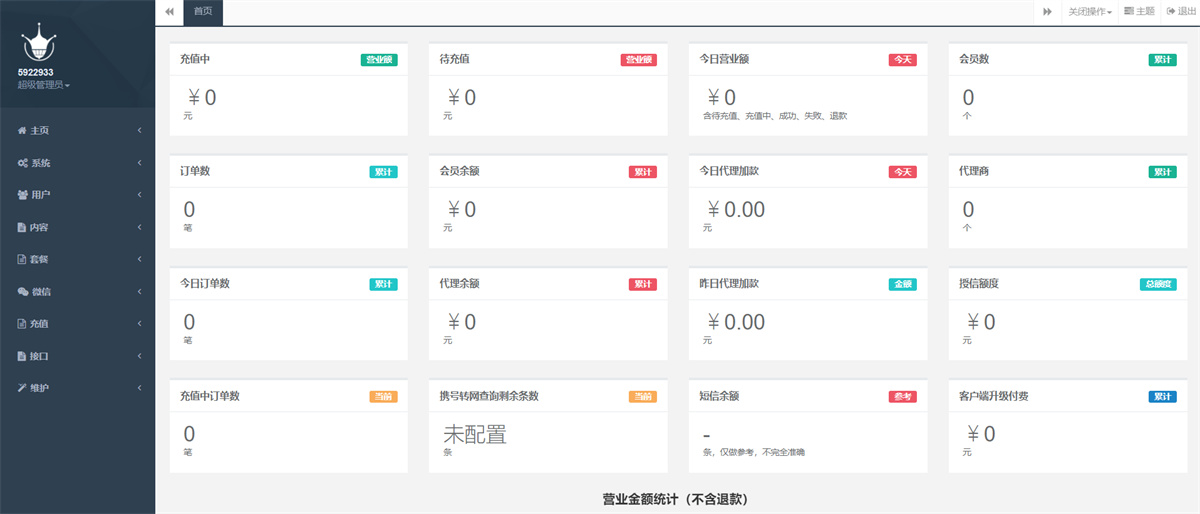 最新大猿人中控充值系统 免授权破解版 支持公众号H5、分销等功能 功能简介:大猿人中控系统目前是市面上用的最多的电话费充值中控系统, 支持代理分销、公众号H5、API接口对接等功能,也是目前最完善的一款中控系统,前端全开源,已破解免授权! 配置环境:php7.3 + Redis
