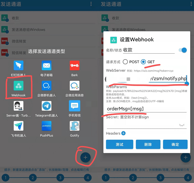 1、打开APP,选择【发送通道】点击【Webhook】,选择【GET请求】 ,输入notify.php 所在服务器的URL,下面的参数填写【orderMsg=[msg]】即可。