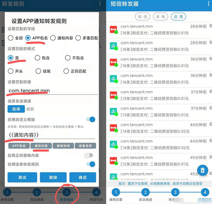 2、选择【转发规则】,点击【应用】,添加转发规则,【APP包名】,选择【是】,包名输入【com.tencent.mm】,选择的发送通道是上一步你创建的通道,下方的模板直接选择通知内容即可。