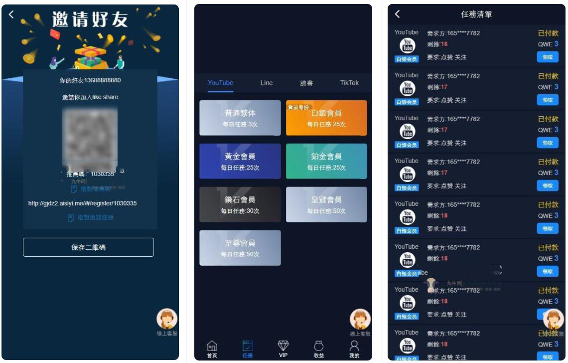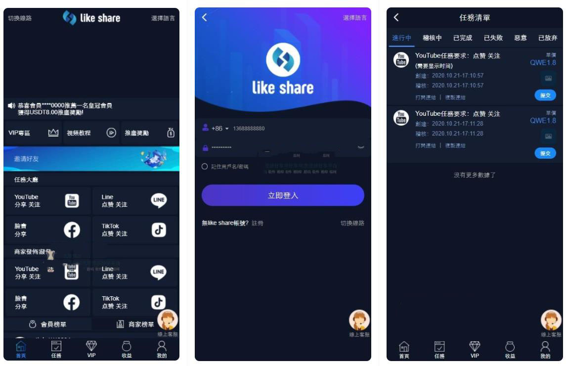前台:首页可领取脸书tiktok等点赞关注任务!八种语言,登陆界面可切换选择。任务等级分为七种,每种等级领取的任务数量各不同。三级分销,没级代理各不同。可查看个人信誉度。