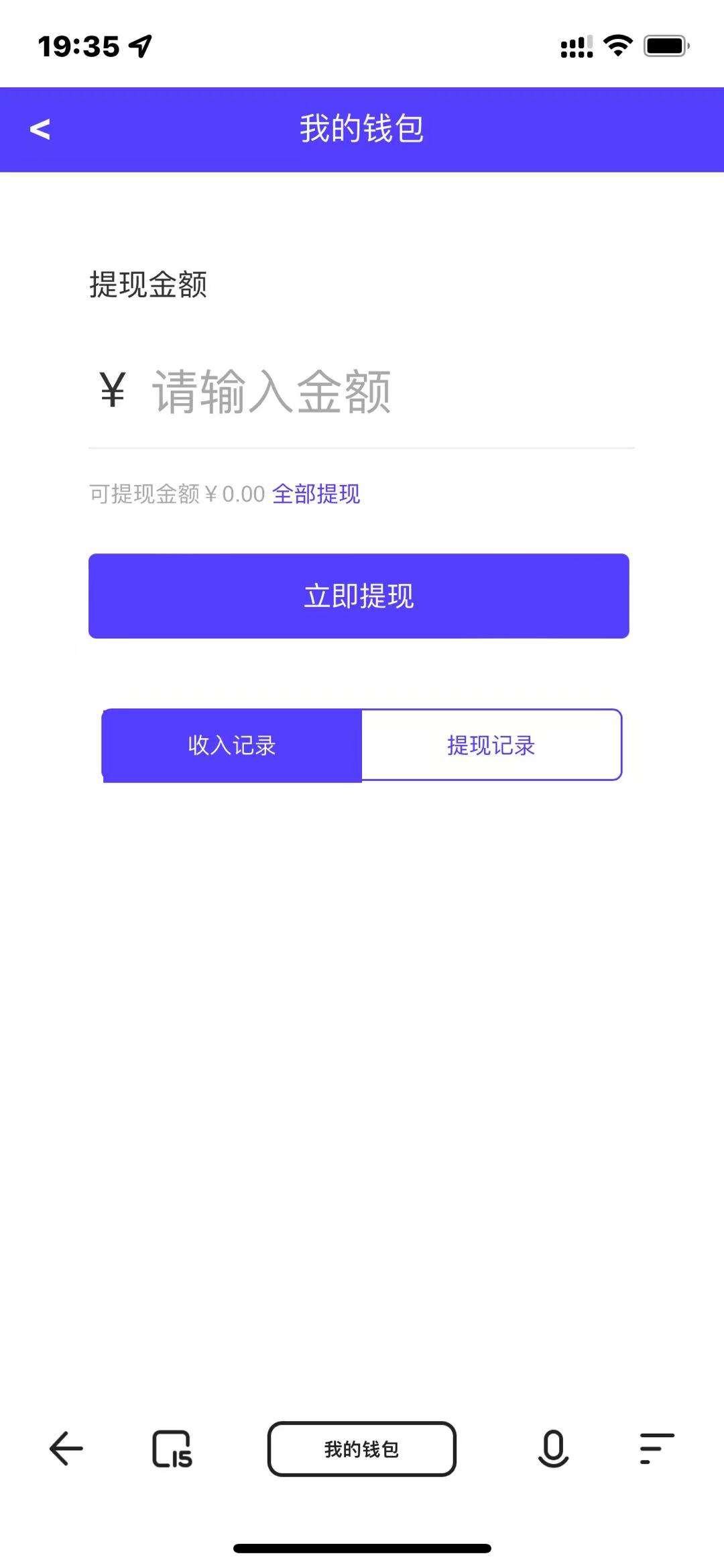 我的钱包:账户余额,提现收款码(线下转账),收入记录,提现记录